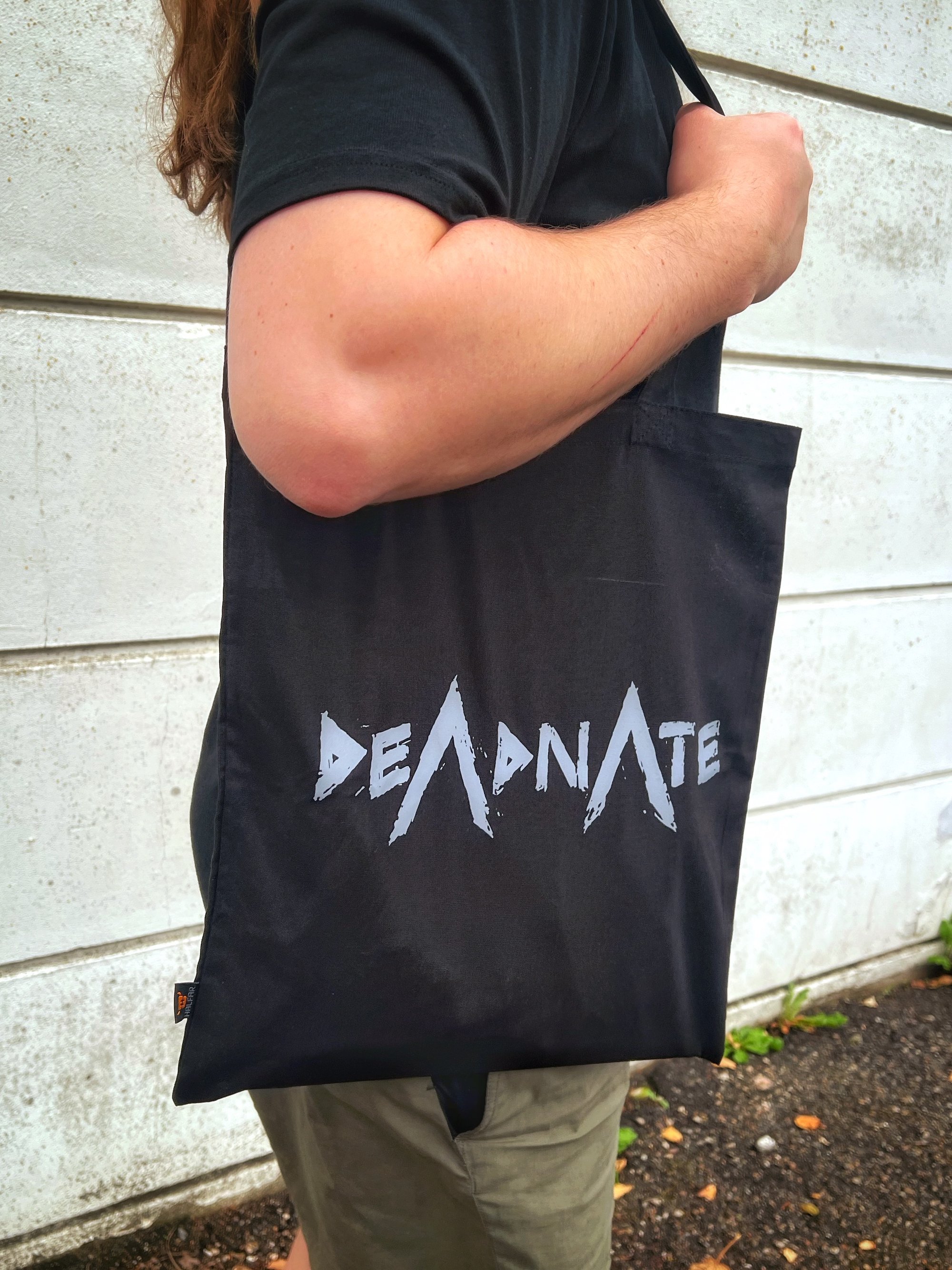 Black tote bag with a grey 'Deadnate' logo printed on one side.